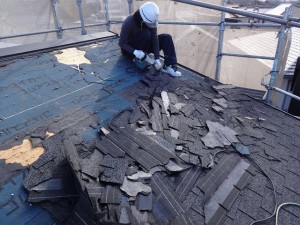 雨漏り原因はケラバ唐草の板金の納まり不良と二次防水材であるアスファルトルーフィングの選定ミスと診断し、屋根を張り替えることになりました。屋根材をはがしてみると案の定、下地合板が湿っていました。