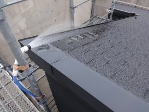 赤外線調査結果をもとに、念には念をいれて散水調査を実施し、雨漏りの再現を試みました。本件雨漏りは2階には被害状況は見られず、1階の和室に漏れていたので他社は屋根を疑わなかったのですが、散水調査結果、雨漏りを再現しました。