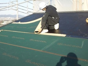 施工途中の降雨が心配されたので、合板をしっかり乾かしてから仮防水処置を施し、ブルーシートで雨養生を行いながら作業を進めました。こうした工事中の雨漏りの二次被害を防ぐことも重要だと考えます。